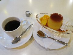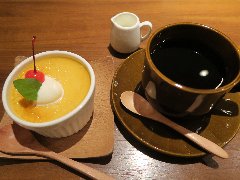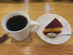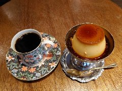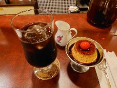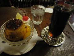 亀戸駅東口から南に4、5分、亀戸緑道公園沿いにあります。白壁に緑色の看板が目印です。店内は、テーブルが9つありました。ボックスシートもあります。やや薄暗く何となくレトロな雰囲気があります。ブレンドとホームメイドプリン(セットで700円)を注文しました。コーヒーはどっしりとコクがありました。プリンは、昔ながらのしっかりタイプ、けっこう「す」が入っていました。フルーツと生クリームが添えられます。美味しかったです。そして安いです。他には、各種ドリンク、お酒、パフェ、フラッペ、ハンバーグ、ビーフシチューなどがありました。まったりのんびり出来ました。 |