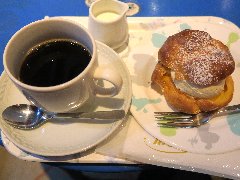 神保町駅から1分、靖国通り沿いのビルの1階にあります。裏の路地からも入れます。入口からアート感があります。店内は、テーブルが多数、割りと広いです。2つのフロアがあります。壁一杯に城戸真亜子氏の絵画が掛かれているフロアと赤い壁のフロアがあります。赤い壁には抽象的な絵画が飾られていました。かなりアートなお店です。古瀬戸ブレンド(540円、セットで100円引き)とシュークリーム(480円)を注文しました。コーヒーは炭火焙煎だそうです。シュークリームはサクサクの生地にチーズ入りのカスタードクリームが入っていました。どちらも美味しかったです。他には、ストレートコーヒーなど各種ドリンク、カレーやサンドウィッチなどもありました。 |