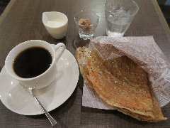 神保町駅から北に3分ほど、錦華通り沿いにあります。細いビルの1階にあります。茶色い板張りの外観です。店内は、テーブルが8つありました。小ぢんまりしていて家庭的な雰囲気です。ムゥサブレンド(540円)とミニガレット(はちみつバター)(450円、セットで100円引き)を注文しました。コーヒーはハンドドリップで淹れます。少し苦めでコクがありました。ミニガレットはそば粉のクレープ、焼き面はパリっとして噛むとモチモチ、甘さがちょうどいいです。袋入りで食べやすかったです。美味しかったです。他には、各種コーヒー、紅茶、ガレット(普通のサイズ)、コンプレットなどお食事ガレットなどがありました。 |