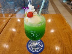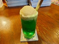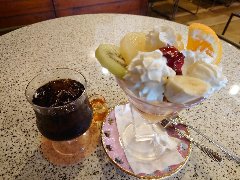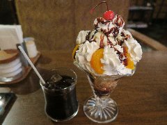 錦糸町駅南口から3分ほど、若干ディープな飲み屋街の路地にあります。ギリシャ遺跡のような装飾の外観、中が見えないのでちょっと入りづらいです。店内は、割りと広くテーブルが多数ありました。ちょっと豪華な照明や椅子、昔のテレビゲーム(現役)のテーブル、テレビでは競馬中継、壁際の本棚には漫画がずらりと並んでいました。かなりレトロで怪しい雰囲気です。アイスコーヒー(400円)とチョコレートパフェ(600円)を注文しました。パフェは巨大です。大量の生クリーム、アイスクリーム、チェリー、みかんにチョコレートが掛かっていました。美味しかったです。見た目は面白いのですがさすがに多過ぎでした・・。他には、各種ドリンク、1ラーメン、ナポリタン、トーストなどがありました。なんと24時間営業です。 |