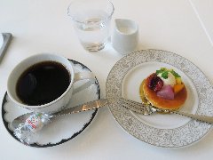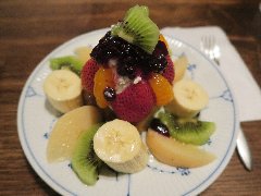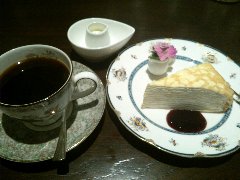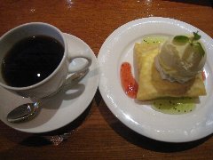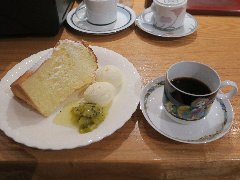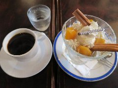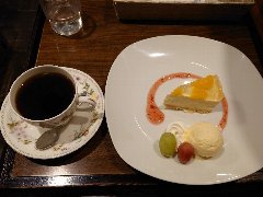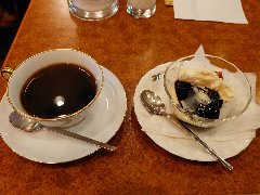 神保町駅から北東側に分ほど、錦華通りから少し路地に入ったところにあります。ビルの1階です。植木に囲まれて見過ごしそうです。店内は、カウンター席が7つ、テーブルが5つありました。アーチ型の天井、太い梁、装飾ガラス、間接照明など、ちょっと薄暗いですが渋くてかなりいい雰囲気です。お冷やはすぐ交換してくれます。レジェブレンド(580円)とケーキ(650円)を注文しました。コーヒーはオールドビーンズを使用、ハンドドリップで淹れます。浅煎りだそうですがコクがあります。ケーキは、ケーキというメニューです。スポンジケーキに生クリーム、その上にみかん、イチゴ、キウイ、ブルーベリー、洋なし、白桃、バナナなど果物が盛りだくさんです。どちらも美味しかったです。とても雰囲気がよかったです。ちょっと高めですが納得です。他には、各種コーヒー、紅茶、フルーツパフェ、トースト、クリームシチューなどがありました。因みに、商品以外は撮禁です。 |