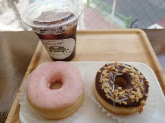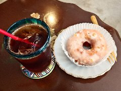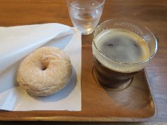 両国駅東口から7、8分、国道14号を渡った住宅街の狭い路地にあります。目指さないと来れません。3階建ての建物です。店内は、テーブルが5つ、小ぢんまりしてました。壁には古いレコードが飾ってありゴダイゴの曲が掛かっていました。独特な雰囲気がありました。ハンドドリップコーヒー(650円)とドーナツ(500円)を注文しました。コーヒーはブラジル豆の中煎りのアイス、ハンドドリップで淹れます。コクがあってバランスよかったです。ドーナツはグレーズドレモン、爽やかな甘さでした。美味しかったです。他には、各種ドリンク、くまさんクッキー、アルコールもあります。 |
