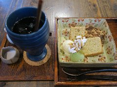 菊川駅から北に4、5分、三ツ目通りの立川三丁目の交差点にあります。マンションの1階です。このお店の外観だけ和の雰囲気です。店内は、テーブルが3つ、奥にも部屋がありました。木材がいっぱい使われ民芸風の雰囲気です。店名の通り犬の同伴もOKだそうです。町家珈琲(冷)とわらび餅入りシフォンケーキとのセット(714円)を注文しました。シフォンケーキとアイスとわらび餅が入っていました。わらび餅は暖かくプニプニしています。きな粉と黒蜜がかってました。美味しかったです。他には、各種ドリンク、冷やしわらびもち、白玉ぜんざい。わらびあんみつ、特製鰻重などがありました。わんこ用アイスもありました。 |