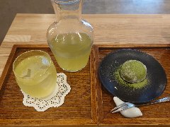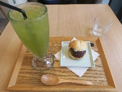 新御茶ノ水駅から3分ほど、淡路町駅からも近いです。ワテラスという商業施設の1階にあります。兵庫県たつの市に、江戸中期創業という大三萬年堂本店の和菓子屋があるそうです。ガラス張りの外観です。店内は、カウンター席が4つ、テーブルが多数ありました。明るくてきれい、華やかな雰囲気があります。日本茶のメニューがいっぱいありました。どらぱん(あんバター)(495円)と冷たい煎茶(セットで550円)を注文しました。どらぱんは、米粉のパンで餡子とバターをサンドしています。パンはモチモチで餡子がたっぷりです。煎茶は濃厚な味わいですがすっきり、たっぷりの量で嬉しいです。どちらも美味しかったです。特に餡子はさすがの美味しさでした。他には、各種日本茶、わらび餅ドリンク、安原流大三ぱふぇ、酒粕ちーずけーき、酒粕ろーるなどがありました。 |