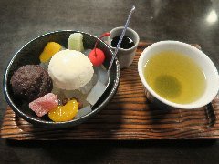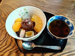 錦糸町駅北口から西に4、5分歩くとあります。ガラスの引き戸の懐かしい感じの外観です。店内は、カウンター席が6つ、テーブルが4つ、座敷にちゃぶ台が1つありました。昭和レトロが香る内装、木造の建物で落ち着きます。茶房特製あんみつ(七福)(860円)を注文しました。抹茶アイス、バニラアイス、最中の皮、求肥、あんこ、白玉、寒てん、きな粉、バナナ、キウイ、グレープフルーツ、オレンジが入っていました。黒蜜が付きます。あんこは丹波大納言の最高級のつぶあんだそうです。小豆、黒蜜、宇治抹茶、白玉など具材には拘っているようです。ちょっと高い気もしますが美味しいです。他には、大納言あんみつ、とろりわらび餅、抹茶ぱふぇ、最高級本葛きり、食事メニューもありました。大福やどら焼きも売っていました。 |
