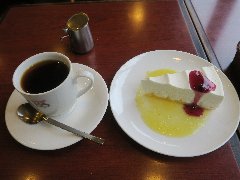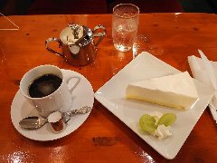 神保町駅から2、3分、水道橋方面に向かった路地裏にひっそりとあります。表には鉢植えが並び青い壁が目印です。以前は古い建物だったようで結構歴史があるようです。こっさこ(喫茶去)とは、禅の言葉で、お茶でもどうですか?というニュアンスだそうです。店内は、若干段差がありテーブルが7つありました。狭い店ですが、縦型ピアノがあり、天井付近の棚にはレコードとCDがいっぱい並んでいます。ジャズが流れていました。お洒落で雰囲気がいいです。シングルレコードのジャケットで出来たメニューが面白いです。自家焙煎珈琲(中煎)(600円)とレアチーズケーキ(350円)を注文しました。珈琲は深煎、中煎、浅煎から選べます。適度に酸味があり美味しいです。店員さんはとても丁寧でした。 |