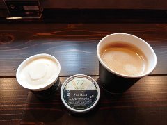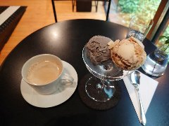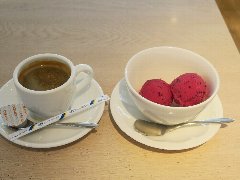 四ツ谷駅麹町口から2分ほど、国道20号から番町文人通りに入るとあります。ビルの1階です。ガラス張りの外観です。店内は、カウンター席が11、外にテーブルが3つとストーブが置いてありました。ジェラートの容器が並ぶカウンターとお酒が並ぶカウンターがありました。お酒の種類はかなり多いです。コーヒーとピスタチオのジェラート(セットで840円)を注文しました。コーヒーは4種類の豆から選べます。ブラジル産のセニュールニキーニョにしました。中深煎りでバランスいいです。ジェラートは小さなカップに入っていました。滑らかでピスタチオ感が強いです。美味しかったです。他には、各種ドリンク、ジェラートは、ミルク。焦がしキャラメル、とちおとめなど14種類ありました。 |
