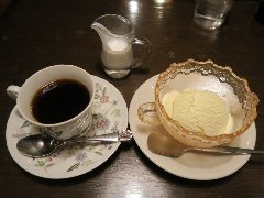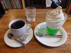 淡路町駅から2、3分、淡路町の交差点から北東方向の路地にあります。ビルの1階です。レトロな看板です。創業は昭和8年の老舗です。店内は、テーブルが8つありました。入口からは一段下がってフロアがあります。やや薄暗いです。赤い椅子、低いテーブル、ステンドグラスの照明などレトロな雰囲気です。クラッシックが流れていました。アンプレス(餡子のトースト)が有名で度々メディアに出るそうで、この日は直前にTVに出たらしく、アンプレスは売り切れですと先に言われました。ブレンド珈琲とコーヒーゼリー&アイスクリーム(セットで700円)を注文しました。コーヒーはコクがあり割りと酸味がありました。ゼリーも同じように酸味ありアイスクリームで中和します。美味しかったです。他には、各種ドリンク、フレッシュジュース、トースト、アンプレスなどがありました。 |