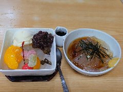 築地駅、新富町駅から2分ほどの路地にあります。店内は、カウンター席が4つ、テーブルが1つありました。狭いですがきれいなお店です。てんまめ(780円)を注文しました。注文が入ってから寒天を切ります。ピクルスと黒蜜が付きます。寒天の上に、白インゲン豆、黒豆、赤エンドウ豆、餡子が乗っています。神津島産の天草から作る生寒天は、味が濃くサクサクした食感がいいです。餡子や豆類は素材の美味しいさが良く出ています。始めはそのままで、途中から黒蜜入れて頂きます。きな粉も足せます。素朴な味ですがとても美味しいです。口直しのピクルスも美味しいです。他には、黒豆きなこ、白玉煮小豆、ごま小豆、ところてんなどがありました。店主は気さくな方でした。テイクアウト用はショーケースに入っています。 |