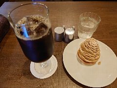 西大島駅から東に4、5分、新大島通り沿いにあります。3階建てのビルの1階です。店内は、テーブルが5つ、和室にテーブルが2つありました。奥に長いです。入口付近に焙煎機が置いてありました。暖色系の壁で落ち着いた雰囲気です。ドリップのアイスコーヒーとモンブラン(セットで750円)を注文しました。コーヒー自家焙煎、程よい苦味とコクがありました。モンブランはきれいな形、ねっとりとして風味がよく、底はクッキー生地でした。美味しかったです。他には、各種ドリンク、紅茶、サンドウィッチ、ガレット、各種ケーキなどがありました。モーニングもあるようです。 |