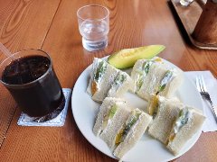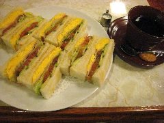 有楽町駅のすぐ近くにある新有楽町ビルの地下にあります。店内は茶色のソファー、壁には絵画など、レトロ感が漂います。テーブルは多数あり、テーブルの上には懐かしい100円のおみくじが置いてありました。レコードからはエルトン・ジョンが流れていました。スペシャルサンドゥイッチ(700円)とドリンクセット(250円)でホットコーヒーを注文しました。サンドゥイッチには、レタス、キュウリ、トマト、ハム、玉子が挟んであります。パンは少し炙っています。ソース類は使っておらず薄味です。美味しいです。コーヒーには小さなビスケットが付いていました。喫煙可です。落ち着くお店だと思います。 |