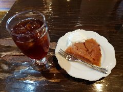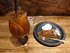 大江戸線の両国駅から5分ほど、北斎通りを東に進みちょっと路地に入った所にあります。ビルの1階、石のような壁です。店内は、カウンター席が6つ、テーブルが多数ありました。割りと広くて開放的な雰囲気があります。白壁で配管むき出し、壁がスクリーンになっていました。アイスコーヒーとりんごのタルト(ケーキセットで780円)を注文しました。アイスコーヒーはすっきり味わい、りんごのタルトはリンゴとカスタードクリームがたっぷり、凍った小さい果物が添えられていました。美味しかったです。そして安いです。他には、各種ドリンク、パスタ、カレーなどがありました。朝8時から営業、モーニングあります。 |
