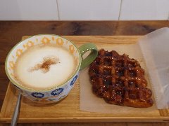 大江戸線の両国駅から1分、北斎通り沿いにあります。ビルの1階です。白壁に薄紫色の扉の外観です。店内は、カウンター席が6つ、テーブルが1つありました。明るくてきれいです。ちょっと場違い感がありました。店内はスパイシーな香りが漂います。マイチャイ(650円)とクロワッサンワッフル(+450円)を注文しました。マイチャイはオリジナルブレンドのスパイス、アッサムティー、北海道産の牛乳、三温糖で作るそうです。マグカップでたっぷり、けっこうスパイシーで辛味がありました。ワッフルは温かくサクサクモチモチでした。美味しかったです。他には、ストレートチャイ、グリーンティーチャイなどがありました。 |