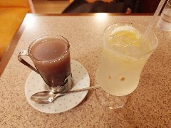 鐘ケ淵駅東口から4、5分、鐘ケ淵通りを南東に進み少し路地に入るとあります。住宅街です。2階建ての建物の1階です。大きなガラスの外観、オレンジ色の庇が目印です。店内は、カウンター席が5つ、テーブルが多数ありました。明るくきれい、奥の部屋は広々しています。レモンスカッシュ(550円)と水だしコーヒーゼリー(480円)を注文しました。レモンスカッシュはレモン果汁100%と炭酸、酸っぱくていいです。ゼリーはややしっかりめでコクがあります。どちらも無糖で甘さは自分で調節します。美味しかったです。他には、各種ドリンク、パスタ、カレー、デザートなどがありました。 |