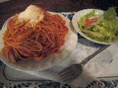 神保町駅の近く、路地を1分ほど歩くとあります。レンガ造りの外観は渋いの一言です。店内には、赤い椅子のテーブル席が多数あります。カウンター席もあるようですが、使用しているかは不明です。やや薄暗く、木の柱、レンガの壁などかなり雰囲気があります。ランチメニューから、特製ソースナポリタンのセット(950円)を食べました。セットにはスープ、サラダ、コーヒー(ブレンド、ウインナー、アイス)が付きます。ナポリタンは、ベーコン、タマネギ、ピーマンが入っていました。シンプルで懐かしい味です。ランチメニューのもう1つはラドリオ特製チキンカレーです。ドリンクがコーヒー以外だと1050円です。 |