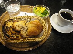 都営新宿線の大島駅の近く、大島中の橋商店街にあります。パン屋ですが店内で割と広いイートインスペースがあります。うすかわあんパンが人気のようで11時半で売り切れていました。モーニングセット(450円)(11時半まで)を食べました。77%ぶどうパン+2種類のパンの他に、ヨーグルト又はサラダ、コーヒー又は紅茶が付きます。パンはチョコのパン、クロワッサンを、後はサラダとコーヒー選びました。パンはトーストしてあって焼きたてで美味しいです。この料金ではお得なセットですね。 |