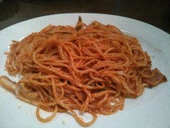 神保町の交差点のすぐ近くの路地にあります。開店の11時に10人の行列が出来ていました。外観は植物に囲まれています。店内は半二階と半地下のフロアがありちょっと薄暗いです。テーブルは多数あります。4人席に1人で座ったとしても相席にはしないようです。ナポリタン(650円)とイチゴ生ジュース(500円)を頂きました。具はマッシュルーム、ベーコンです。かなりの山盛りです。サラダ付きです。昔ながらの味で美味しいです。イチゴ生ジュースはかなり甘いです。凍らせた果肉が入っているようです。雰囲気はいいのですが、人気店なので外に待っている人が見えると何だか落ち着きませんね。 |