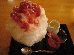 亀戸駅から10分ほど、蔵前橋通り沿いにあります。亀戸天神のすぐ近くです。入口で予約の札をもらい少し待ちました。入口脇には小さな池があり鯉が泳いでいます。建物は純和風でガラスの引き戸が趣あります。店頭では名物の葛餅や和菓子が売られています。店内に案内されると先に食券をかいます。店内は甘味処となっていてテーブルが9つありました。天井が高いです。客はほぼ女性でした。この夏流行ったカキ氷から、苺ミルク(820円)を注文しました。苺ソースと練乳が器に入っていて、自分で氷に掛けて食べます。苺ソースは果肉がたくさん入っていて濃厚です。氷はきめ細かくて柔らかいです。キーンとしないのかと思いましたが、やっぱりしました。他には一通りの甘味のメニューが揃っています。亀戸天神とのセットで人気があります。 |