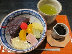 門前仲町、富岡八幡宮の近くの永代通り沿いにあります。店内はテーブルが5つあります。落ち着いた雰囲気です。あんみつ(620円)を食べました。餡子も寒天も手づくりっぽくて美味しかったです。厳選素材で拘りの製法なのだそうです。その他、カキ氷の種類が多いです。お汁粉、くずきりなどもあります。深川めし、うどん、雑煮など食事も出来るみたいです。ちょっと値段が高い気もします。テイクアウトも出来るようです。 |