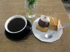 ![]() | 福生駅東口から7、8分、やなぎ通り沿いにあります。マンションの1階です。看板にはWORDCOFFEEと書かれていましたが、これは前の店名のようです。白壁の外観です。店内は、カウンター席が2つ、テーブルが3つありました。白壁で明るく、ドライフラワーなどが飾られお洒落な雰囲気です。ハンドドリップ(480円)とエスプレッソクリームとあんこのスコーンサンド(380円)を注文しました。コーヒーは、ブラジルとエチオピアのブレンドだそうでやや酸味ありました。スコーンサンドは、スコーンの上にたっぷりの餡子とほんのりコーヒー味のクリーム、面白い組み合わせです。やや食べにくかったです。美味しかったです。他には、各種ドリンク、プリン(売り切れ)、トーストなどがありました。 |