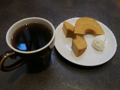 ![]() | 稲城長沼駅北口から3分ほど、旧川崎街道沿いにあります。2階建ての建物です。洒落たガラス戸の外観です。ざるやという酒屋の隣にあります。店内は、カウンター席が5つありました。やや薄暗く静かです。壁の木の棚がお洒落な感じです。本日のコーヒー(650円)とプリン(320円)を注文しました。コーヒーは豆を選びます。マンデリンにしました。コーヒーはハンドドリップで淹れます。コクがあってバランスよかったです。プリンは昔ながらの味わいでした。美味しかったです。他には、各種ドリンク、トースト、チーズケーキなどがありました。 |
