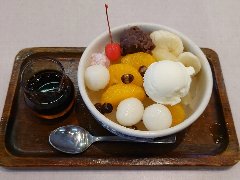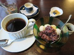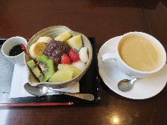 ![]() | 都電の三ノ輪橋駅から1分、細い路地にあります。分かりにくい場所です。創業は昭和23年だそうです。外観は普通の民家です。店内は、1階にカウンターが4つ、2階にテーブルが6つありました。古い建物ですがリフォームされてきれいです。窓から見える向かいの家が近く下町の雰囲気です。あんみつコーヒーセット(780円)を注文しました。チェリー、バナナ、キウイ、イチゴ、パイナップル、りんご、餡子、白玉、黒豆、寒天が入っていました。黒蜜が付きます。具だくさんで美味しかったです。他には、トースト、ピザ、オムライス、ビーフシチューなどいろいろありました。8時半からモーニングもあります。 |