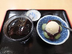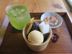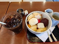 ![]() | 国分寺駅南口から1km弱、お鷹の道の近くにあります。2階建ての建物です。塀があって門もあります。庭も広いです。店内は、テーブルが3つ、デッキテラスにテーブルが4つありました。外観は一軒家風ですが中は蔵の中のようになっています。吹き抜けで天井が高く太い梁が見えます。箪笥の階段があり2階もあるようでした。古民家風で落ち着きます。人の良さそうな女将よると、夏は休業していてこの日は2ヶ月ぶりのオープン日だったようです。アイスコーヒー(400円)とクリームあんみつ(500円)を注文しました。あんみつには、りんご、桃、梨、柿、キウイ、バナナ、オレンジ、バイン、ぶどう、あんこ、寒天が入っていました。盛りだくさんで嬉しいです。ホイップクリームがなかったようで団子もサービスしてくれました。アイスコーヒーにはお菓子も付きます。とても美味しかったです。他には、各種ドリンク、しょうゆだんご、フルーツだんご、黒蜜きな粉アイスなどがありました。 |