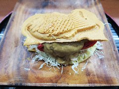 ![]() | 都電荒川線の小台駅から1分、小台の交差点の近くにあります。ちょっと分かった店名です。店内は、カウンター席が8つ、テーブルが2つ、座敷のテーブルが4つありました。明るくてきれいです。スマホを使って注文します。たいやきバーガー(土日限定)(800円)とたいやき(つぶあん)(200円)を注文しました。たいやきバーガーには、パプリカ、バイン、キャベツ、パテ、カレーソースがたい焼きでサンドされていました。ちょっと食べにくくてナイフとフォークで食べます。けっこう大きくてボリュームあります。かなりのB級感です。たい焼きは熱々で羽があって皮がしっとりしていました。あんこが美味しかったです。他には、ローストビーフ丼、海老プリ丼、カレーチーズたいやきなどがありました。メニューが変わってます。 |