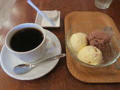 ![]() | 清瀬駅南口から4、5分、南口ふれあいど〜り沿いにあります。マンションの1階、木の扉です。店内は、テーブル席が6つありました。少し薄暗いです。お洒落な雰囲気が漂います。流れる音楽が小さな音で静かでゆったりしています。ブレンドコーヒー(470円)と黒糖求肥と白玉のクリームあんみつ(820円、セットで250円引き)を注文しました。ブレンドは中煎り、フレンチプレスで淹れるそうです。割りと酸味が強めでした。あんみつには、生クリーム、バニラアイス、赤えんどう豆、白玉、求肥、くるみ、あんこ、寒天(白と抹茶)が入っていました。黒蜜が付きます。白玉、求肥は手作りだそうです。寒天はプニプニした変わった食感でした。美味しかったです。他には、水出しアイスコーヒー、スコーン、カスタードプリンなどがありました。テーブルの上以外は基本的に撮影禁止です。 |