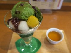 ![]() | 大山駅南口から2、3分、ハッピーロード大山商店街にあります。お茶屋さんです。店内は、手前がお茶や茶器の売り場、奥にお休み処があります。カウンター席が7つありました。壁には茶審査技術七段の認定證が掲げてありました。抹茶パフェ(880円)を注文しました。抹茶アイスクリーム、求肥、白玉、栗、生クリーム、あんこ、抹茶ゼリーなどが入っていました。濃厚な宇治抹茶が心地よい苦みで爽やかでした。美味しかったです。さすがにほうじ茶も美味しかったです。他には、かき氷、抹茶ラテ、抹茶セット、煎茶セットなどがありました。 |