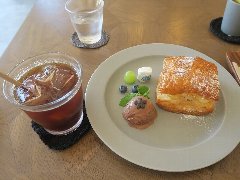 ![]() | 小平駅南口から南東に4、5分、多摩湖自転車道沿いにあります。あじさい公園の隣にあり、そぐ脇を小川用水が流れていました。門をくぐるとアプローチがあり、外のウッドテラスにテーブルがいつかありました。店内は、テーブルが3つ、大テーブルが3つありました。明るくてウッディで優しい雰囲気、大きな窓から公園の緑がよく見えます。森のコーヒー(490円)とリンゴとスフレチーズのタルト(460円、セットで50円引き)を注文しました。コーヒーはオーガニック、少し酸味がありフルーティーな味わいでした。ケーキは、ふわりとしたスフレにリンゴの食感がいいです。美味しかったです。他には、各種紅茶、台湾茶、パフェ、小平産ゆずケーキなどがありました。ランチもあります。スタッフは皆さん女性でした。 |