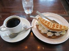 ![]() | 清瀬駅北口から1.5kmほど、志木街道沿い、市役所通りとの交差点の近くにあります。車でないとちょっと行き辛い場所です。青い屋根にレンガ壁、教会のような三角屋根の建物です。店内は、テーブルが多数、2階もあります。木造の建物で天井が高く吹き抜けになっています。とても豪華な造りで雰囲気がいいです。不便な場所ですがかなり混んでいました。マイルドコーヒーとチョコバナナワッフル(セットで980円)を注文しました。コーヒーはバランスがいいです。ワッフルはふわふわで柔らかいタイプ、生クリームがたっぷり入っていました。美味しかったです。他には、各種ドリンク、オムライス、各種グラタン、各種トーストなど食事メニューが豊富です。朝8時から営業しています。 |