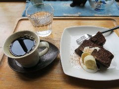 ![]() | 鳩ノ巣駅から5、6分、国道411号の鳩ノ巣トンネルの旧道から坂を下り、さらに旅館の脇から小道を下っていくとあります。鳩ノ巣小橋という吊り橋の脇です。木造の建物です。店内は、カウンター席が多数ありました。各地の食料品などが陳列販売されていました。カウンター席は全て窓側を向いています。窓からはすぐ下に鳩ノ巣渓谷が見え、川の音が大きく聞こえます。ホットコーヒー(500円)とチョコバナナケーキ(500円)を注文しました。コーヒーはオーガニック、コクがありバランスもよかったです。ケーキもオーガニック素材を使用しているそうです。添えられるのはクリームではなくヨーグルト、これはイマイチでした。美味しかったです。他には、各種ドリンク、かぼちゃのケーキなどがありました。食事メニューもあるようです。 |