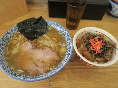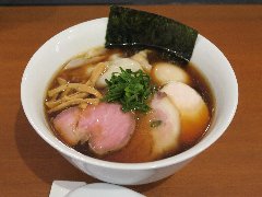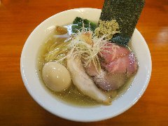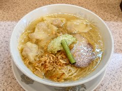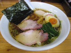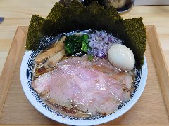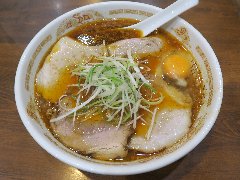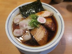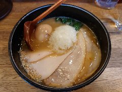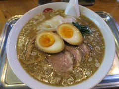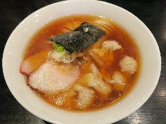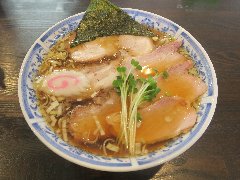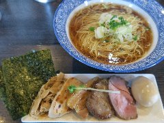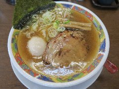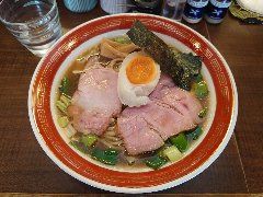 ![]() | 松本駅東口から2.3kmほど、県道63号沿い、薄川を渡った辺りにあります。前面は駐車場の平屋の建物です。金土日は朝7時から営業しています。9時で少し並びました。店内は、カウンター席が6つ、座敷にテーブルが2つありました。大きな厨房がありました。朝専用中華そば(醤油)の全部乗せ(1210円)を注文しました。チャーシュー、メンマ、味玉、ワンタン。刻み玉ねぎ、刻みネギが乗っていました。麺は細めで縮れていました。スープは魚介と動物系の出汁、きれいな色です。あっさりめのスープは朝にはちょうどいいです。美味しかったです。チャーシューも美味。他には豚骨醤油らあめん、信州味噌らあめんなどがありました。 |