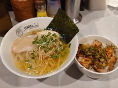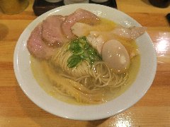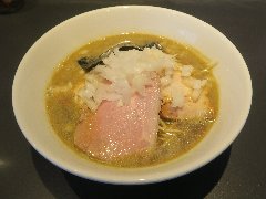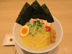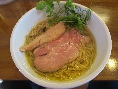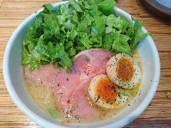 ![]() | 富士宮駅北口から8分ほど、県道414号の市役所南の交差点の近くにあります。マンションの1階です。ラーメン屋っぽくない白壁の洒落た外観です。店内は、カウンター席が8つ、テーブルが多数ありました。結構広くて明るくてきれい、カフェのような雰囲気です。鶏白湯の合鴨セット(1016円)を注文しました。海苔、玉子(半)、穂先メンマ、プチトマト、チャーシュー(2種類)、水菜、刻みネギが乗っていました。柚子胡椒は別皿です。麺は太めの平打ちです。スープは鶏白湯、北海道産のホワイトチキンで出汁を取るそうです。割りとさらさらしていて味はマイルドです。海苔が富士山型、チャーシューは鶏胸肉と合鴨です。美味しかったです。他には、醤油白湯、海老担々、豆乳みそなどがありました。 |