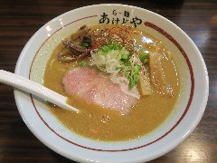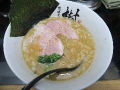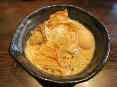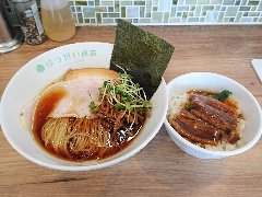 ![]() | 遠州岩水寺駅から5、6分、国道152号沿いにあります。黄色いポール看板が目印です。店内は、くの字のカウンター席が多数ありました。けっこう広い厨房です。壁にはお絵かきが飾ってありました。濃厚ふわとろチャーシュー麺(1200円)と朝採れコーチン玉子かけ(250円)を注文しました。チャーシュー、板のようなメンマ、味玉(半)、刻み葉ネギが入っていました。麺はやや太い平打ちです。スープは豚骨と魚介などの出汁、泡立っています。クリーミーで旨味たっぷりです。レアチェーシューは大きくて5枚も入っていました。TKGにはオリジナルの醤油が付きます。どちらも飯美味しかったです。ちょっと高い気もします。他には、豚うるわしらーめん、楽描あえだまなどがありました。 |