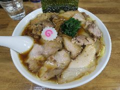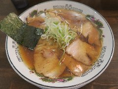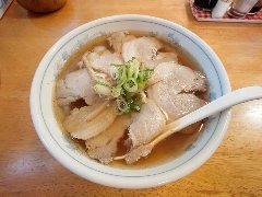 ![]() | 甲府駅南口から1.5kmほど、県道3号から鍛冶屋通りに入るとあります。ガラス張りの外観、きれいな建物です。道路の向かいにある駐車場は広いです。1964年の創業だそうです。店内は、カウンター席が5つ.テーブルが多数、座敷も広いです。けっこう広く天井が高く明るくてきれいです。チャーシュー麺(1100円)を注文しました。海苔、ナルト、メンマ、チャーシュー(4枚)、刻みネギが入っていました。麺は中細で縮れていました。スープは鶏ガラや魚介の出汁、やや甘めでした。、チャーシューはかなり分厚くて大きく4枚も入っていました。かなり食べ応えあります。食べ切るのにちょっと疲れました。美味しかったです。他には、支那そば、ワンタン麺、炒飯、餃子などがありました。基本的に量が多いです。 |