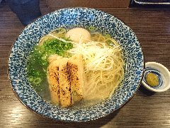 麺屋しらかわ | ラーメン | 岐阜県高山市相生町 | ★ (2016.10.14) | 普通 | ![]() | 高山駅から5、6分、国分寺通り沿い、鍛冶橋の交差点の近くにあります。店内は、カウンター席が7つ、テーブルが2つありました。ランチ営業もしていますが、夜の部は21時という遅い開店です。それでも待ち客がいました。観光地だけに外人客も多く、店員さんは英語で説明していました。繁盛していて活気があります。中華そば(並)(700円)と味付け玉子(100円)を注文しました。海苔、炙りチャーシュー、メンマ、たくさんの刻みネギ、味玉、黒コショウが入っていました。麺は、細めで縮れています。スープは、鶏がら、魚介、野菜の出汁で濃いめの醤油味、表面を油が覆っています。美味しいですが、ちょっとしょっぱく感じました。メニューは、中華そばの並と大と味付け玉子のみです。店員さんは丁寧です。22時頃にもまだ待ち客がいました。 |