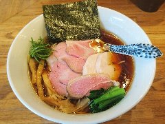 ![]() | 甲斐住吉駅から10分強、県道113号沿いにあります。2階建ての1階です。外には植木が並んでいました。店内は、カウンター席が5つ、大テーブルが1つありました。ラーメン屋っぽくない雰囲気です。醤油ラーメン(900円)+特製煮たまご(150円)を注文しました。チャーシュー、メンマ、白髪ネギ、刻みネギが入っていました。麺は自家製、中細で縮れていました。スープは鶏ガラ、豚骨ガラ、魚介を合わせた出汁、無化調で作るそうです。旨味が豊富で優しい味わいです。チャーシューが大きくて柔らかいです。美味しかったです。他には、あっさり鶏そば醤油、塩ラーメン、特製味噌ラーメンなどがありました。ランチのみの営業です。 |