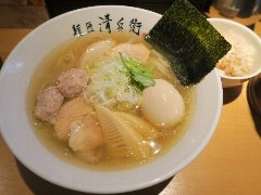 ![]() | 京都駅中央口から3、4分、京都タワービルの地下1階にあります。お店が複数ありフードコートのようになっていて混沌としています。お店にもカウンター席が4つありますが、どこで食べてもいいようです。洛(1080円)を注文しました。丼は金属です。具は別皿でチャーシュー(豚と鶏)、味玉、ほうれん草、丼の方に刻みネギが入っていました。麺はやや太めのストレートです。スープは鶏と煮干などの出汁、濃くて甘味がある醤油で色も濃いです。ちょっとしょっぱめですが美味しかったです。他には、座、紫などがありました。夜のフードコートはほぼ飲み屋状態で騒がしかったです。 |