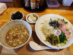 ![]() | 竜王駅から2kmほど、旧甲州街道沿いにあります。何軒かお店が並ぶ建物の一部です。店内は、カウンターが8つありました。明るくてきれいです。大きなコンクリート?のカウンターが特徴的です。つけそば(1030円)を注文しました。つけ汁にチャーシュー、メンマ、長ねぎが入っていました。麺は太めのストレートです、つけ汁は鶏出汁、きれいな色で醬油は強めです。チャーシューは2種類、大ぶりです。美味しかったです。スープ割りはちょっとぬるくてムムムでした。また、ちょっと高い気がします。他には、淡麗昆布水つけ麺、醬油らぁ麺などがありました。 |