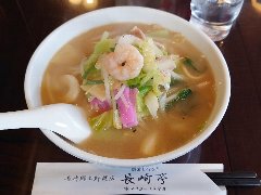 ![]() | 長崎電鉄の大浦天主堂駅から1分、国道499号の松が枝駐車場の交差点の近くにあります。明治32年の創業、ちゃんぽんと皿うどんの発祥のお店です。5階建ての立派な建物で、2階へ上がる大階段があります。夜はライトアップされちょっと圧倒されます。1階は土産屋、2階はちゃんぽんミュージアム、5階に展望レストランがあります。店内は、テーブルが多数、とても広いです。大きなガラス張りの窓からは長崎の夜景が見えます。ちゃんぽん(1080円)、鶏の唐揚げ(702円)、焼餃子(324円)などを注文しました。ちゃんぽんは、錦糸玉子、かまぼこ、豚肉、エビ、イカ、もやし、玉ねぎ、キャベツ、きくらげなど具だくさんです。麺は太めで柔らかめでした。スープは、鶏ガラと豚骨などの出汁、いろいろな旨味が出ていました。美味しかったです。他には、皿うどん、炒飯、中華料理や点心が多数ありました。見た目の豪華さの割りに庶民的なお値段でした。混んでいました。 |