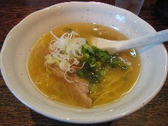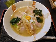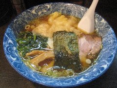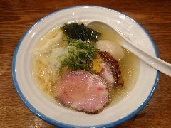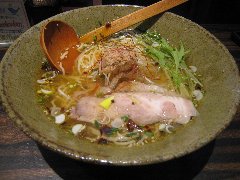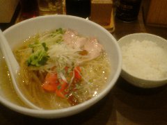 海神 | ラーメン | 東京都新宿区新宿 | ★★ (2010.9.29) | 普通 | ![]() | JR新宿駅南口のすぐ近く、雑居ビルの2階にあります。カウンター席が5、テーブル席が3、ありました。店内は狭いです。あら炊き塩らあめん焼きおにぎり付き(950円)+味玉子(100円)を食べました。大盛り無料です。鶏つくね、海老つみれ、しらがねぎ、みょうが、大葉、糸とうがらしが入っていました。細めの麺です。スープは透き通ったきれいな色であら汁から作るです。あら汁には日替わりの魚が使われているのか大きな紙に張り出していました。そこにはヒラマサ、カンパチ、金目鯛、真鯛、イサキと書かれていました。美味しいです。麺を食べ終わった後におにぎりをスープに入れて雑炊にします。浅いスプーンで雑炊はちょっと食べにくかったです。 |