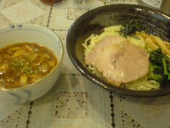らーめん紬麦 | ラーメン | 東京都千代田区神田平河町 | ★ (2011.9.6) | 普通 | ![]() | 秋葉原駅から2、3分、国道4号沿いにある地下飲食街にあります。つむぎ、と読みます。ちょっと階段を降りるのに躊躇しますが地下は意外ときれいです。外観は白、店内もきれいです。カウンター席が7つ、テーブルが3つあります。ホールのおばちゃんがいい感じです。つむぎつけ麺(900円)+中盛り(50円)を食べました。麺側にチャーシュー(2枚)、ほうれん草、めんま、刻み海苔、スープ側に、くたくたのネギ、麺はさぬきの夢という国産を使っているそうです。スープは無化調で鶏、魚介から作るそうです。蕎麦のつけ汁のようにあっさりしていて甘め、ゴマの香りがします。割りスープはポットに入っています。 |