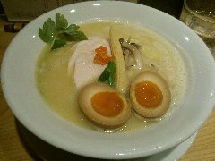 潮 | ラーメン | 東京都千代田区神田淡路町 | ★★ (2014.3.14) | 普通 | ![]() | 淡路町駅のすぐ近く、外堀通り沿いにあります。階段を降りた半地下にあります。店内は銀色のアルミのような壁です。カウンター席が9つ、テーブルぽい席が1つあります。メニューには白と黒があります。白 鶏白湯そば(840円)を食べました。大盛は無料です。揚げネギ、刻みパセリ、ブロッコリー、肉巻きアスパラ、ポーチドエッグが入っていました。麺は普通の太さでストレートです。スープは大山鶏を使った鶏白湯です。濃厚な鶏のスープは美味しいですが、もはやラーメンのものではないです。具もかなり独創的なので、もう単品のスープのようです。因みに、黒 にほんいち醤油そばは、魚介系スープのようでこちらも美味しそうです。店員さんは丁寧です。 |