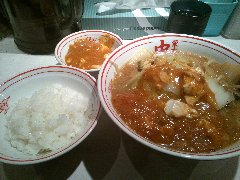 蒙古タンメン中本 | ラーメン | 東京都港区高輪 | ★ (2014.2.15) | 普通 | ![]() | 品川駅高輪口、品達ラーメン内にあります。主に都内に展開する有名なチェーン店です。真っ赤な看板が目立ちます。カウンター席が10、テーブル席は多数あります。蒙古タンメン定食(940円)を食べました。定食には、辛子麻婆と小ライスが付きます。蒙古タンメンには、白菜、もやし、ニンジン、キクラゲ、キャベツ、ニラ、豚肉、豆腐が入っていました。少し太めの麺です。辛味噌のスープに麻婆豆腐が乗っています。片栗粉が多いのかかなりドロってしています。そして結構辛いです。汗が出てきました。定食の辛子麻婆は、蒙古タンメンと同じ味でかぶってますね・・・。他には、北極ラーメン(激辛だそうです)、冷やし蒙古タンメンなどがあります。店員さんは元気です。 |