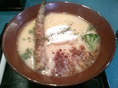 銀座 篝 | ラーメン | 東京都中央区銀座 | ★★★ (2013.12.13) | 普通 | ![]() | 銀座、中央通り銀座三丁目の交差点の近く、狭い路地にあります。かがり、と読みます。和風な佇まいでラーメン屋には見えません。平日の昼前で6人行列の行列が出来ていました。女性も並んでいます。外に並んでいる時に店員さんが注文を取ります。店内も和風、コの字型のカウンターで8席、狭いですがとてもきれいなお店です。厨房の店員さんは板前のような出で立ちです。鶏白湯SOBA(850円)+味玉(100円)を食べました。別皿に薬味の、揚げネギと生姜が出されます。ラーメンには、三つ葉、鶏チャーシュー、シメジ、ヤングコーン、インゲン豆、いくら、味玉が入っていました。麺は細め、スープはとろとろ濃厚な鶏白湯です。とても美味しいです。日本料理のような繊細さ、丁寧さを感じます。イクラ、しめじにはびっくりしました。 |