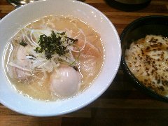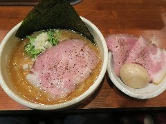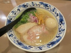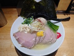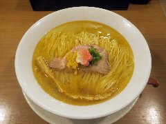 ![]() | 曙橋駅から2分ほど、四谷三丁目方面に向かう新坂の途中にあります。4階建ての建物の1階にあります。金色の文字の看板、大きな提灯が掛かっていました。店内は、カウンター席が7つありました。明るくてきれい、すっきりした内装です。鯛塩そば+鯛茶漬け(1270円)を注文しました。チャーシュー、麩、穂先メンマ、柚子、小ネギが入っていました。麺は細めのストレートです。スープは真鯛の出汁、しっかりした旨味がたっぷりで香ばしさがありました。鯛茶漬けは、鯛めしと真鯛の刺身が入ったゴマだれ付いています。これにラーメンのスープを掛けます。これがよく合います。美味しかったです。他には、鯛塩つけ麺、アサリ煮干しの山かけ冷やし麺などがありました。 |