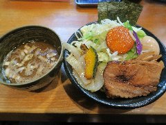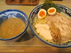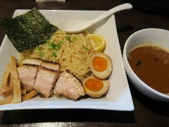 麺者 服部 | ラーメン | 東京都千代田区西神田 | ★★ (2015.3.21) | 普通 | ![]() | 神保町駅から5、6分、水道橋方面に向かう路地にあります。店内はカウンター席が9つ、ちょっと薄暗いです。特製じゅーしーつけめん(1030円)を注文しました。麺の量は大400g、中300g、小200gから選べます。麺側に、チャーシュー、味玉、メンマ、海苔、レモン、青ネギが乗っていました。麺は太めです。スープは豚骨魚介で赤っぽい色をしていて若干スパイシが効いています。レモンを麺に絞ると、味が引き締まって美味しくなります。味玉はベルガモットで香り付けしているそうです。気が付きませんでしたが美味しかったです。チャーシューも美味しいす。スープ割、出来ます。他には、とろ葱塩海老雲呑麺、ネギ海苔らーめん、カレーソバなどがありました。 |