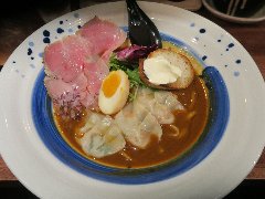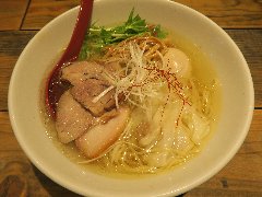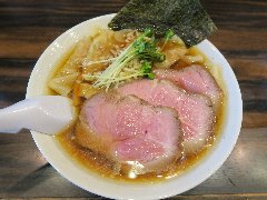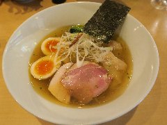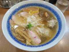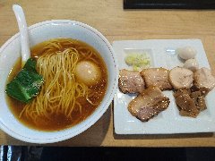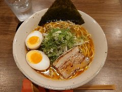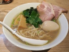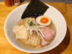 ![]() | 九段下駅から3、4分、飯田橋一の交差点の近くの路地にあります。オレンジ色の暖簾が目印です。開店後すぐに満席になりました。店内は、カウンター席が9つありました。コンクリート風の壁にむき出しのパイプ、ちょっと洒落た雰囲気です。棚にはお酒が並び、つまみもありました。特製中華そば(1000円)を注文しました。三つ葉、味玉、メンマ、チャーシュー(肩ロースとバラ)、ワンタンが入っていました。麺は普通の太さのストレートでした。スープは無化調、鶏ガラがメインで魚介系を合わせています。鶏の旨味がちょうどよく美味しいです。チャーシューやワンタンも美味しかったです。他には、味噌らあめん、イリコそば、汁あり麻辣担々麺、つけそばなどがありました。 |